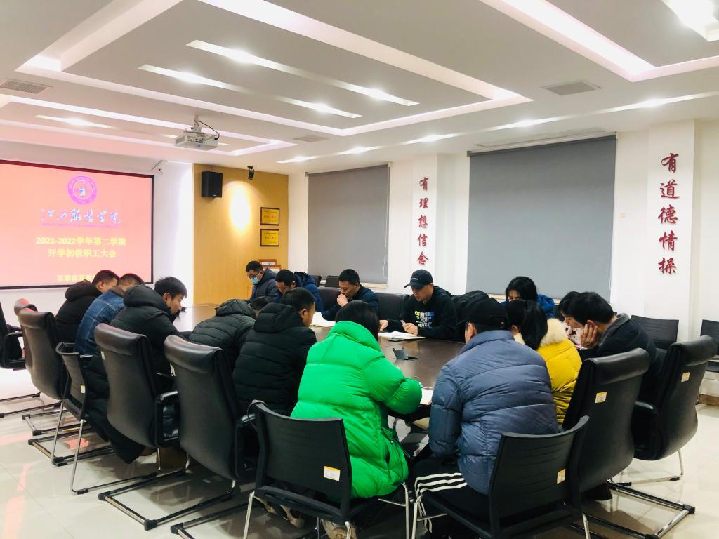 【军体部讯】为确保新学期各项工作顺利开展,永利y23455于2022年2月19日下午3:00,在清源二楼会议室组织召开2021-2022学年第二学期开学初全体教职工大会,永利y23455主任胡伟、副主任褚欢以及全体教师参加了此次会议,会议由部门主任胡伟主持。
