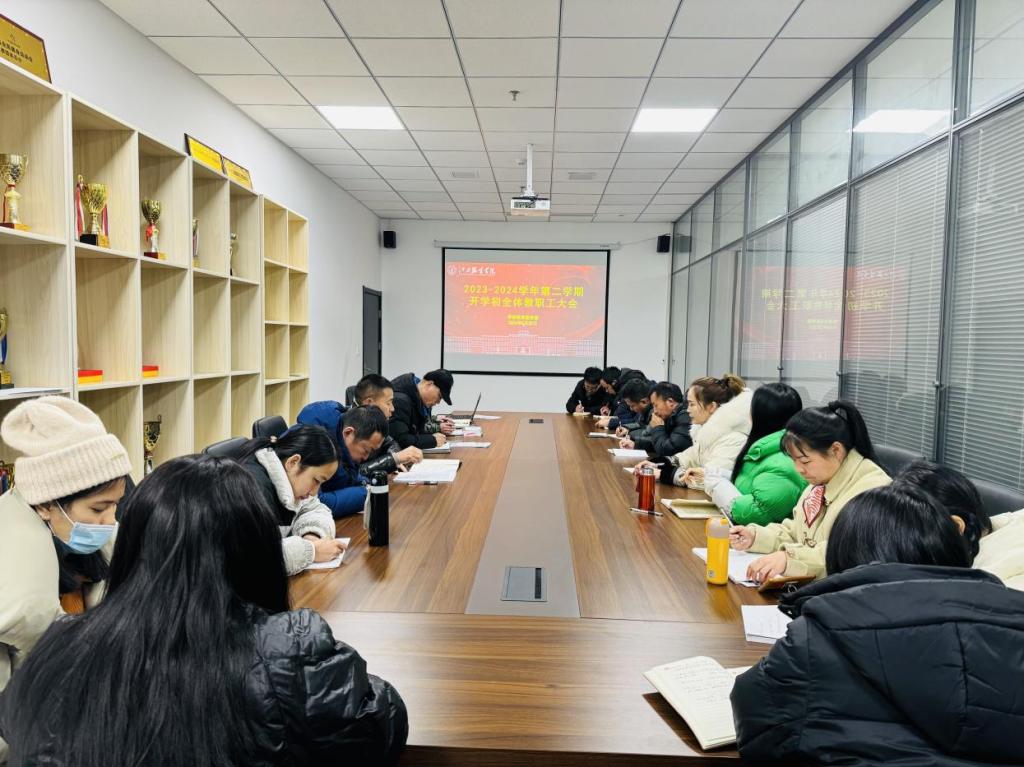 军体部讯为确保新学期各项工作平稳、有序开展,2月25日,永利y23455组织召开2023-2024学年第二学期开学初全体教职工大会,永利y23455主任胡伟、副主任褚欢以及全体教师参加了此次会议,会议由部门主任胡伟主持。