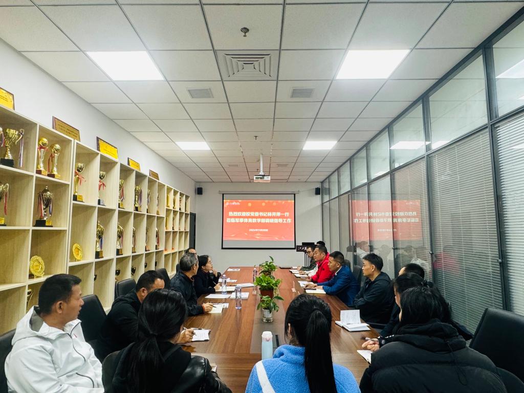 【军体部讯】2024年11月20日上午,校党委书记、督导专员林井萍莅临永利y23455调研指导工作,校党委副书记唐新强、党政办副主任徐道钦陪同调研。永利y23455主任胡伟、副主任褚欢、体育教研室副主任王福滨、军事理论教研室副主任丁楠及骨干教师代表、新教师代表、优秀教练员代表参加了调研座谈会。