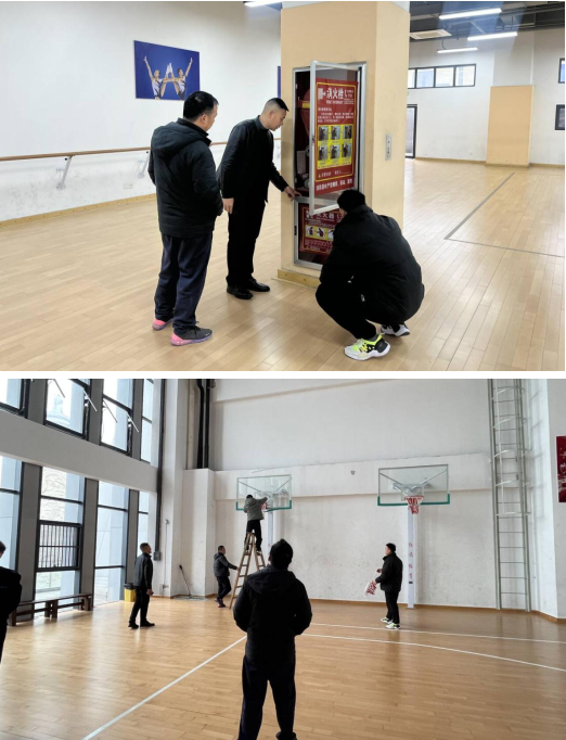 【军体部讯】为进一步规范各教学场所和器材设施安全使用与管理,确保新学期教学工作正常有序运行,2月28日,永利y23455主任胡伟、副主任褚欢带领部门安全检查工作领导小组成员对室内外教学场地、体育器材设施、智慧教室进行全面安全检查。