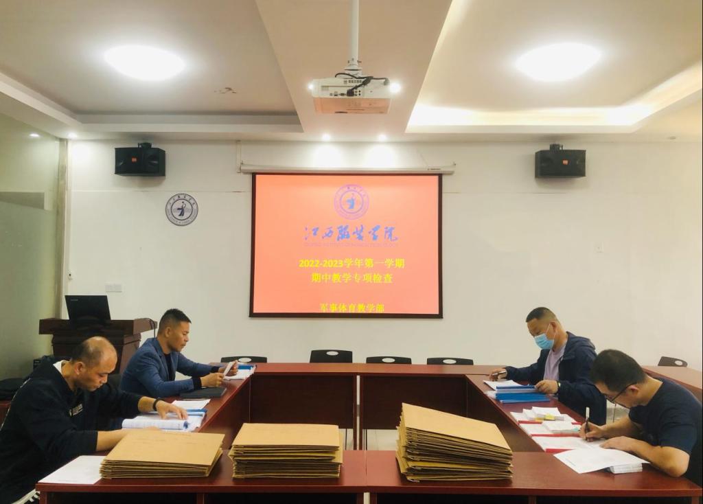 【军体部讯】为全面掌握本学期开学以来教学运行情况,切实提高教学管理水平与教学质量,根据《关于2022-2023学年第一学期期中教学检查的通知》(江服教发﹝2022﹞127号)文件精神,11月7日,永利y23455组织开展2022-2023学年第一学期期中教学专项检查。永利y23455主任胡伟、副主任褚欢同部门日常教学检查成员组成专项检查组,对任课教师教学材料进行全面检查。